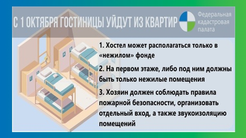 Новое законодательное ограничение. Новый закон вносит изменения в Жилищный кодекс РФ. Поправки запрещают использование жилых помещений (квартир и частных домов) для размещения гостиниц и предоставления гражданам гостиничных услуг. Комментируя ситуацию, заместитель директора Кадастровой палаты по РТ Лейсан Рахматуллина отмечает: «Особенность в том, что ранее отсутствовало законодательное ограничение на оказание гостиничных услуг в жилых помещениях многоквартирных домов. Поэтому квартиры использовались в том числе и для размещения хостелов: небольших гостиниц, похожих на общежития».