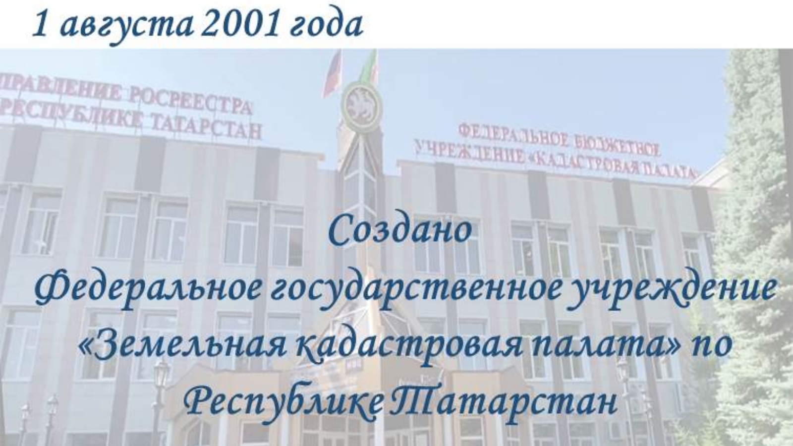 Именно в этот день в 2001 году было создано Федеральное государственное учреждение «Земельная кадастровая палата» по Республике Татарстан. В своем развитии Кадастровая палата претерпела множество реформ и преобразований. Менялось не только ее название, но и структура, направления деятельности, полномочия.