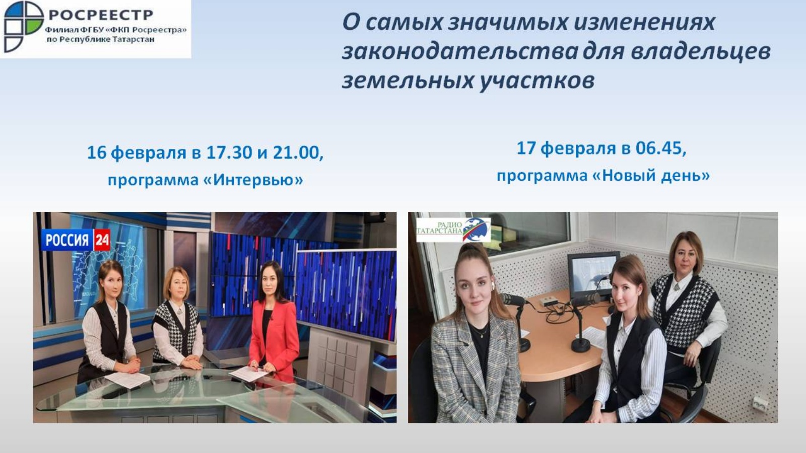 Дополнительно сообщаем, что с записями состоявшихся теле- и радиоэфиров можно ознакомиться на официальном сайте Управления Росреестра по Республике Татарстан rosreestr.tatarstan.ru в разделе «Пресс-служба», в социальной группе «ВК» (vk.com/rosreestr16), а также на канале Росреестр Татарстана на youtube.