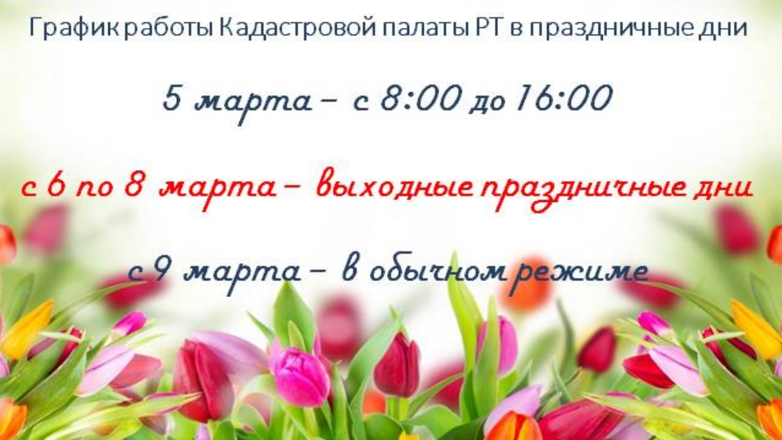 В связи с предстоящим празднованием Международного женского дня 8 марта изменен график работы Кадастровой палаты по Республике Татарстан.