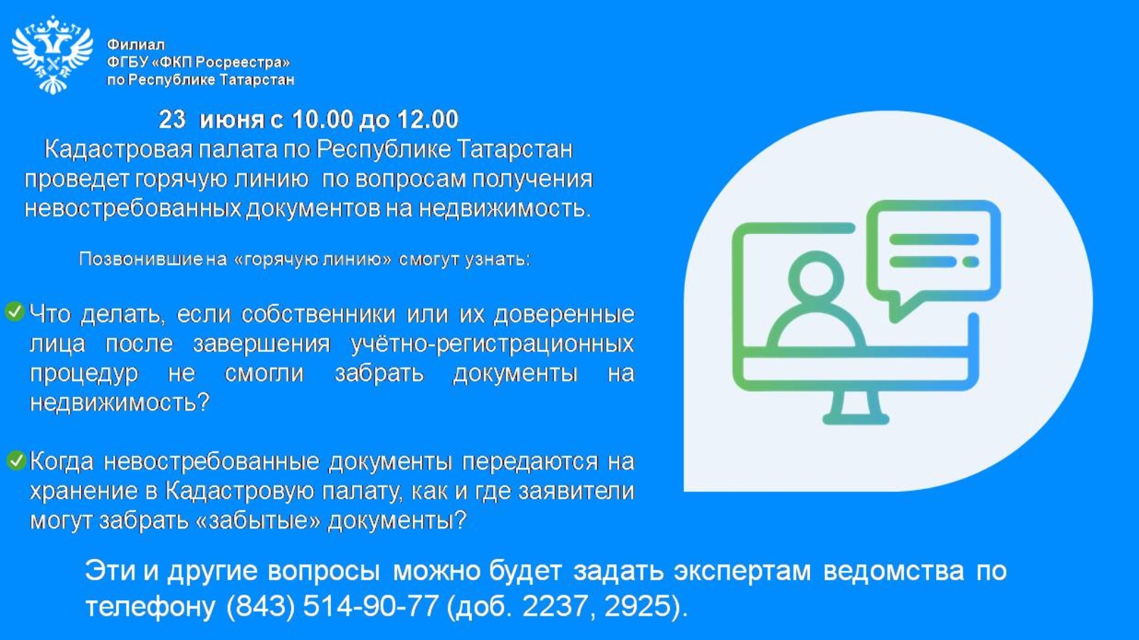 23 июня с 10.00 до 12.00 Кадастровая палата по Республике Татарстан проведет горячую линию по вопросам получения невостребованных документов на недвижимость.