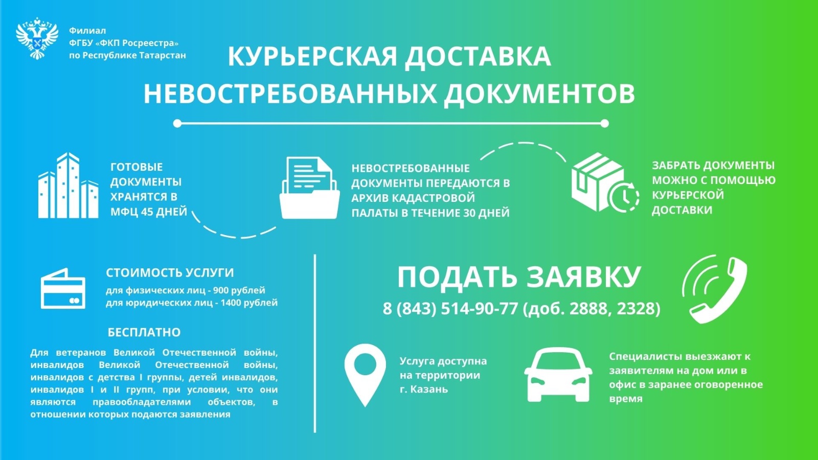 Казанцы могут заказать курьерскую доставку ранее не полученных документов по телефону 8 (843) 514-90-77 (доб. 2888, 2328) или в филиале Кадастровой палаты Татарстана по адресу: г. Казань, ул. В. Кулагина, д. 1.