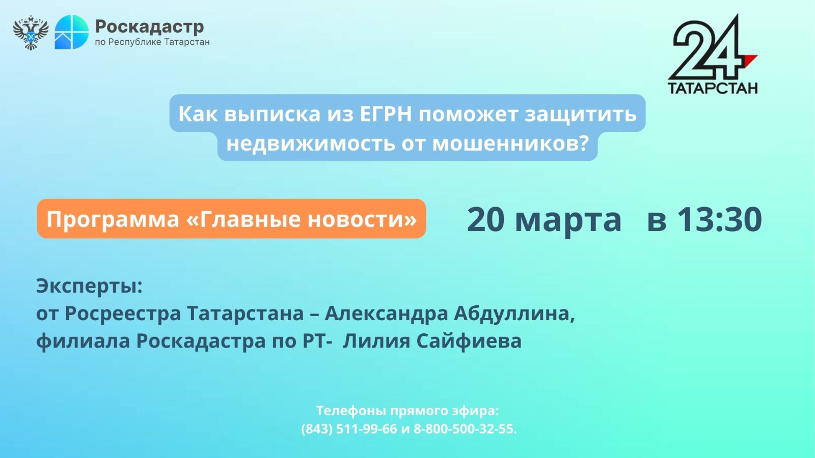 Об этом сегодня, 20 марта, в прямом эфире в программе «Главные новости» на телеканале Татарстан 24 расскажут эксперты: от Росреестра Татарстана – Александра Абдуллина, филиала Роскадастра по РТ- Лилия Сайфиева.