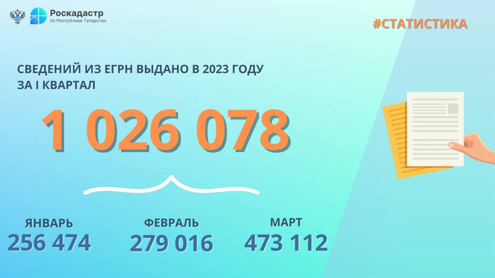 Делимся с вами отчетными данными за 1 квартал 2023 года по количеству сведений, выданных из Единого государственного реестра недвижимости. Это число составило 1 026 078 сведений.