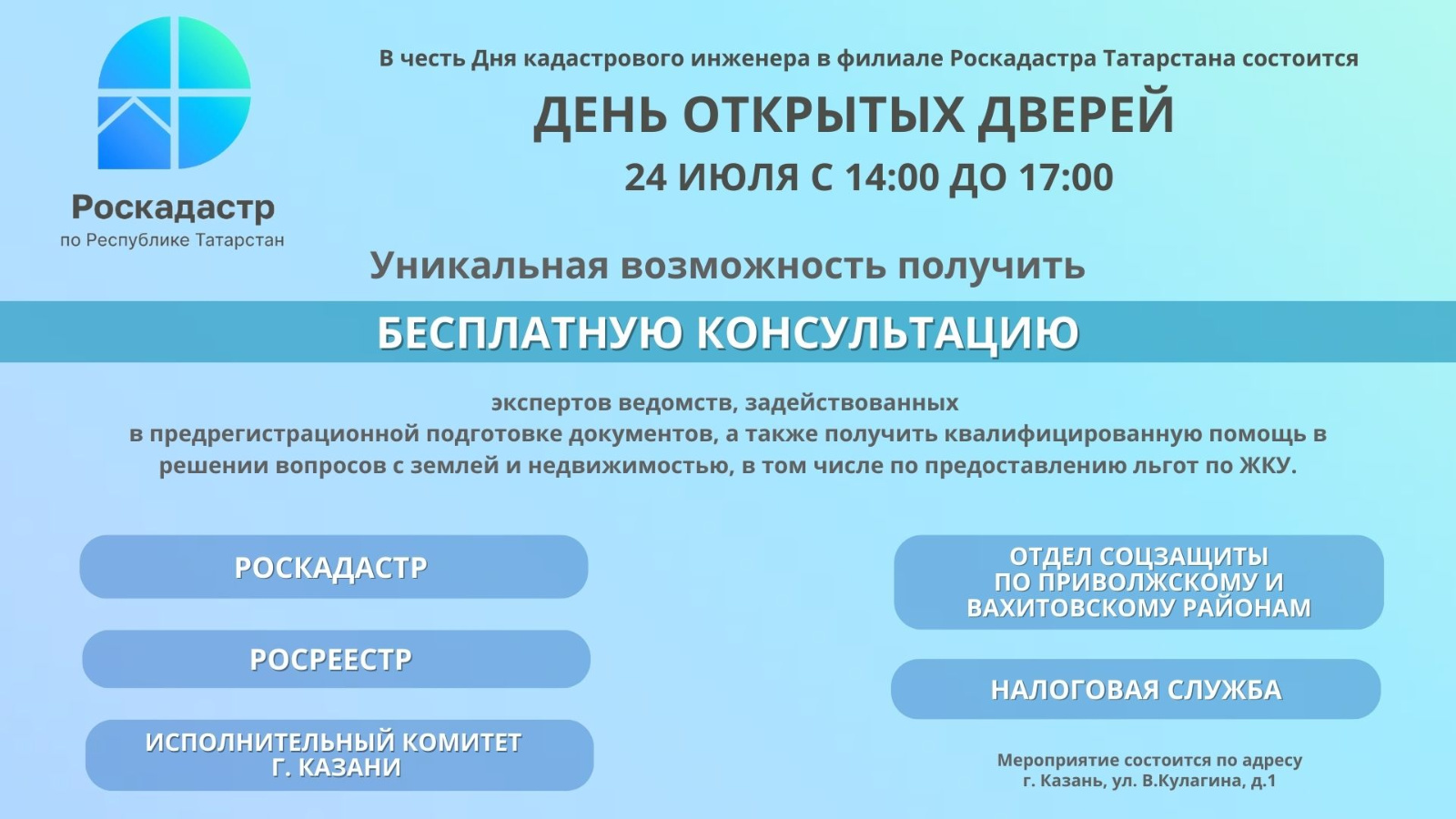 24 июля филиал Роскадастра по Республике Татарстан проведет День открытых дверей, приуроченный к профессиональному празднику – Дню кадастрового инженера.