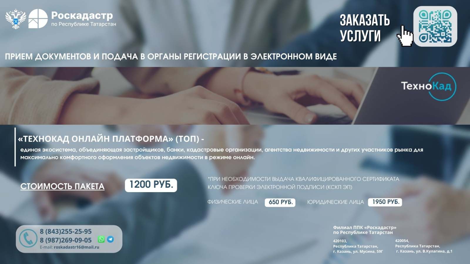 Роскадастр Татарстана является единственным представителем "Технокад Онлайн Платформа" в Республике Татарстан.
