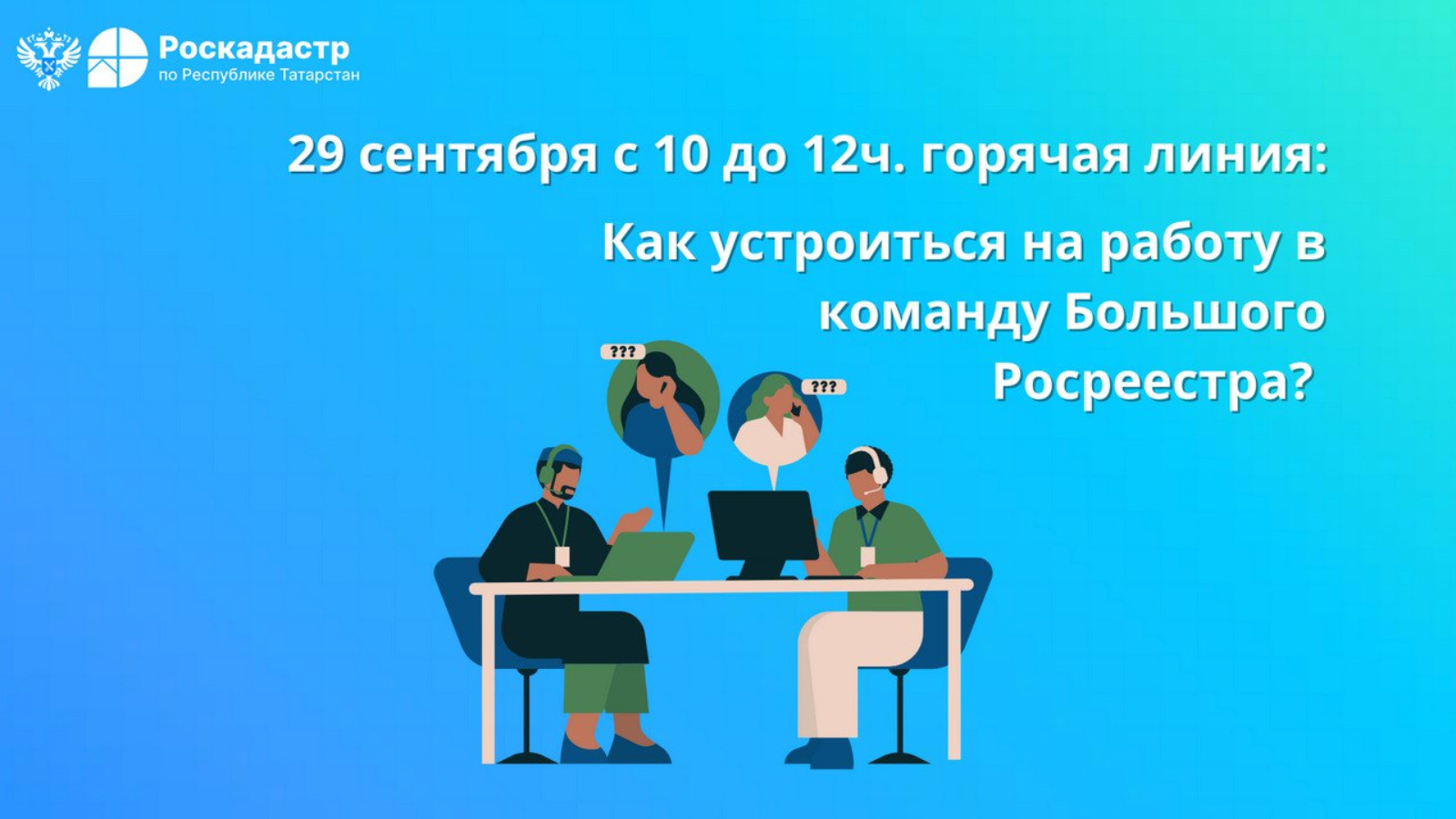 29 сентября с 10 до 12 ч, в рамках месяца «Кадровый потенциал», Роскадастр и Росреестр по Республике Татарстан проведут горячую линию о порядке трудоустройства. Мероприятие приурочено к 15-летию Росреестра.