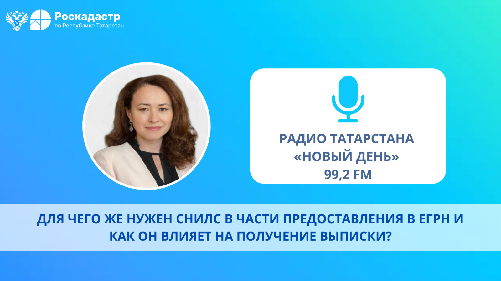 Для чего же нужен СНИЛС в части предоставления в ЕГРН и как он влияет на получение выписки? Об этом обо всем нам в интервью на «Радио Татарстана» рассказала начальник отдела подготовки сведений филиала Роскадастра по Республике Татарстан Фарида Ризатдинова.