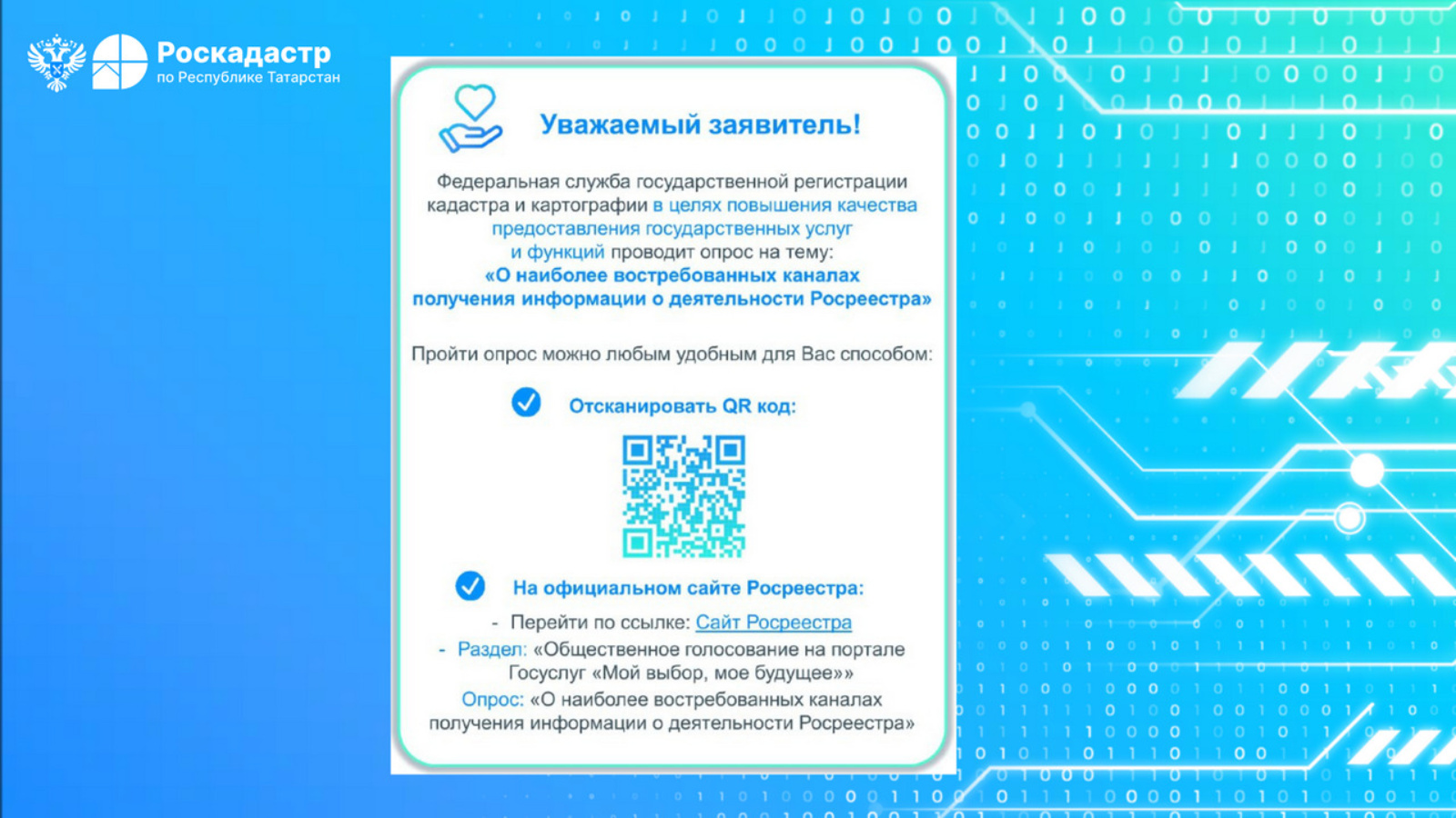 Росреестр в целях повышения качества предоставления государственных услуг и функций проводит опрос на тему: «О наиболее востребованных каналах получения информации о деятельности Росреестра» на платформе обратной связи.