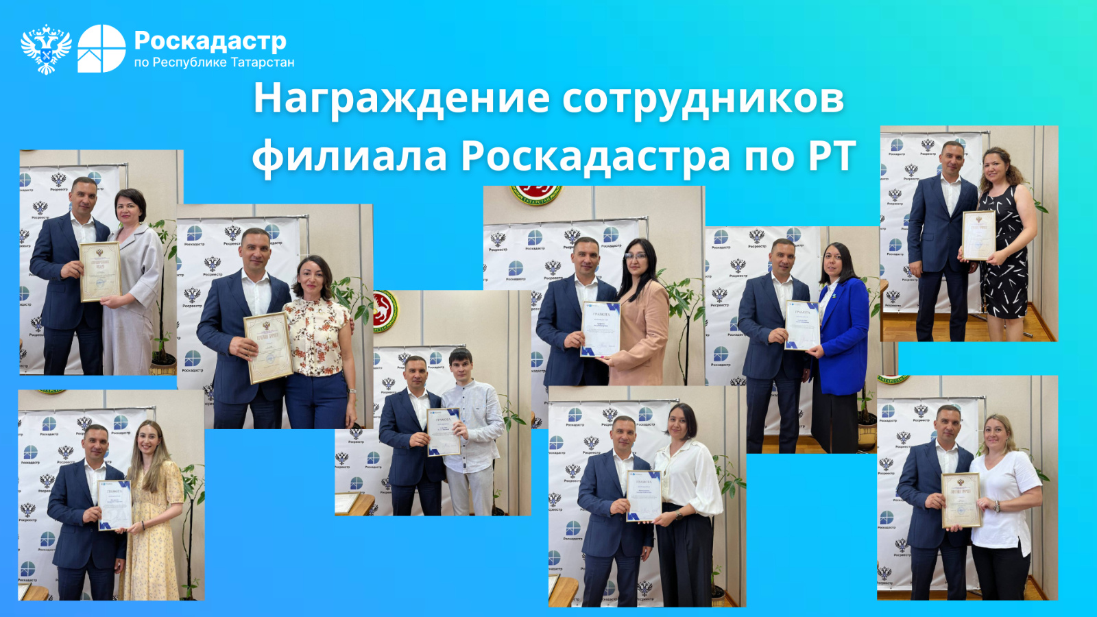 За исполнение служебных обязанностей на высоком профессиональном уровне, добросовестный труд были поощрены Благодарностью руководителя Управления Росреестра по Республике Татарстан - 5 сотрудников, Почетной грамотой Управления Росреестра по Республике Татарстан - 6 сотрудников, Почетной грамотой ППК "Роскадастр" - 1, Благодарность директора ППК "Роскадастр" - 1, Грамотой директора филиала ППК «Роскадастр по РТ» - 7 сотрудников филиала Роскадастра по Республике Татарстан.