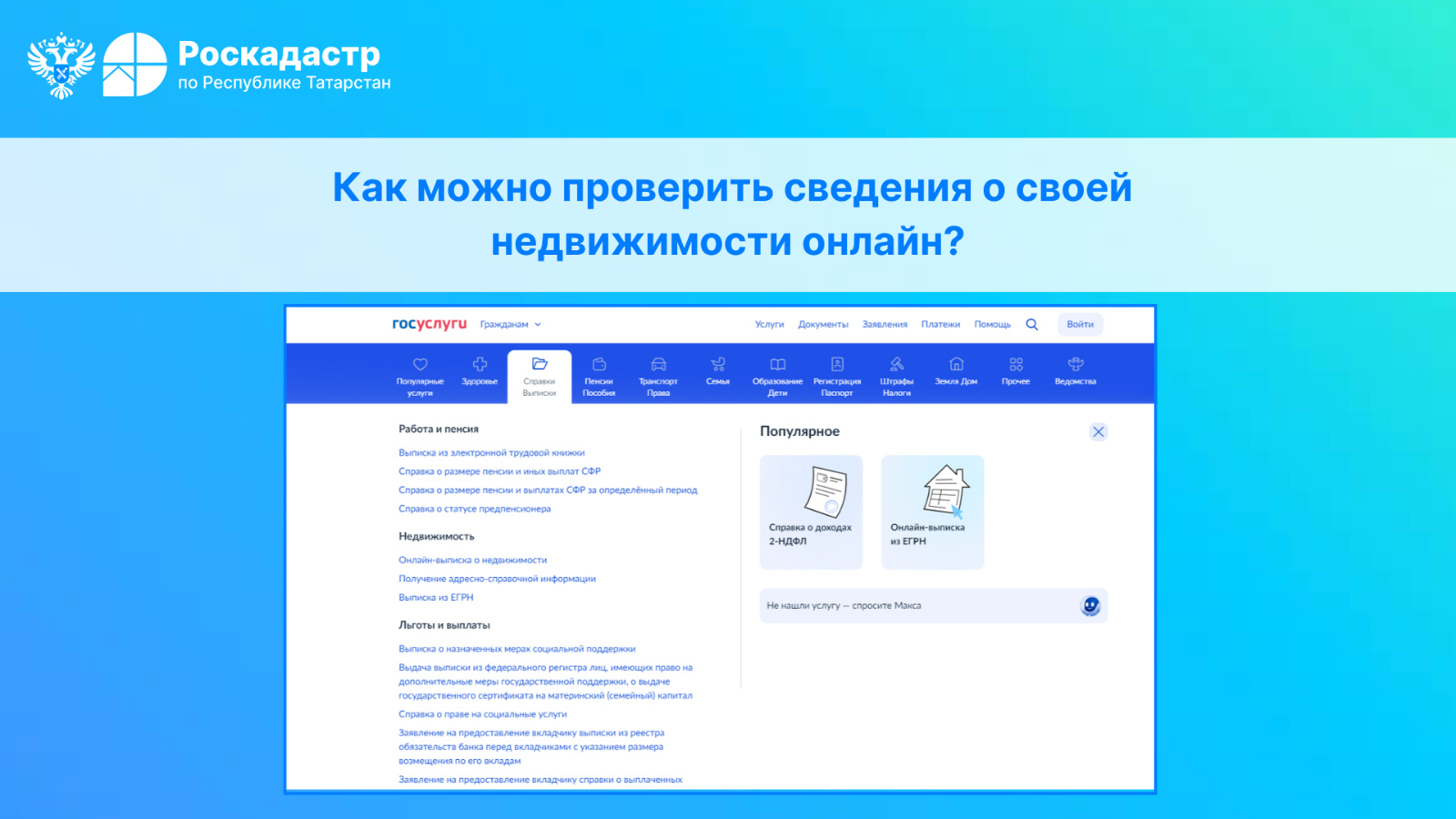 Напоминаем о возможности владельцев недвижимости запросить выписку из Единого государственного реестра недвижимости (ЕГРН) на портале «Госуслуг».
