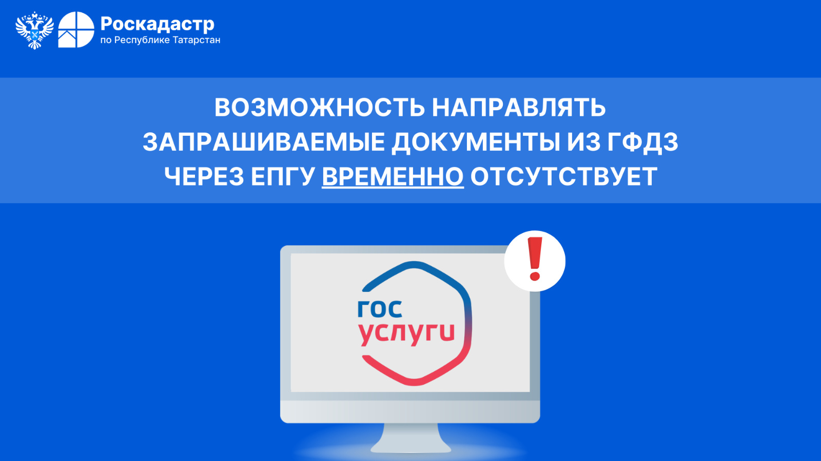 В связи с чем, просим направлять заявления установленного образца о предоставлении документов ГФДЗ по электронной почте: GFDZ_RT16@16.kadastr.ru. Форма заявления размещена на сайте филиала ППК Роскадастр по РТ, вкладка - https://roskadastr.tatarstan.ru/predostavlenie-svedeniy-iz-gosudarstvennogo-fonda.htm.
