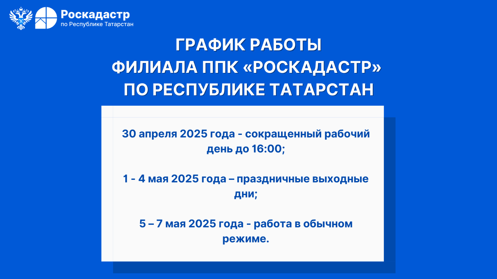 В связи с празднованием Праздника Весны и Труда в график работы филиала Роскадастра по Республике Татарстан внесены изменения.
