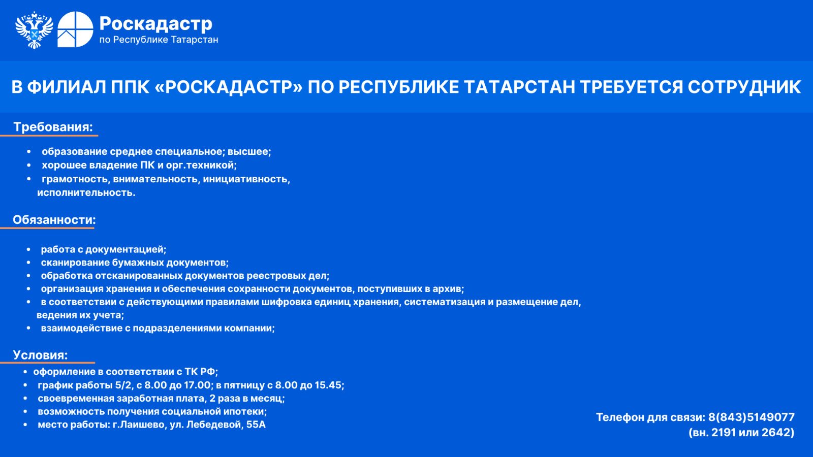 В филиал ППК «Роскадастр» по Республике Татарстан требуется сотрудник.