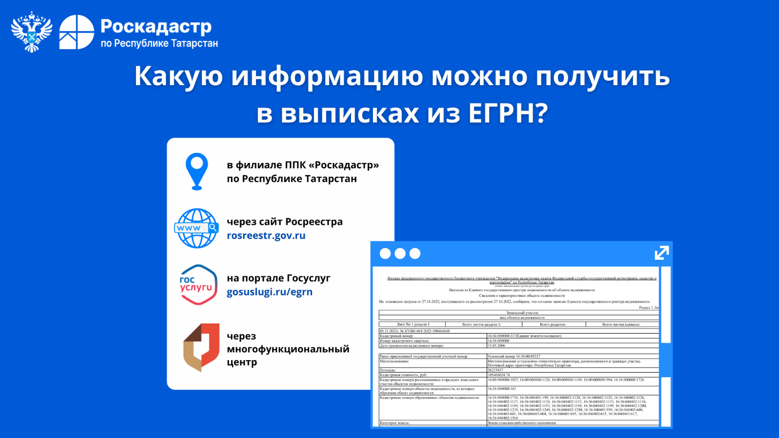 По вопросам получения сведений из ЕГРН можно обратиться в Татарстанский филиал ППК "Роскадастр" по телефону 8 (843) 514-90-77 (доп. 2286) или круглосуточно в ведомственный центр телефонного обслуживания - 8 800 100 34 34.