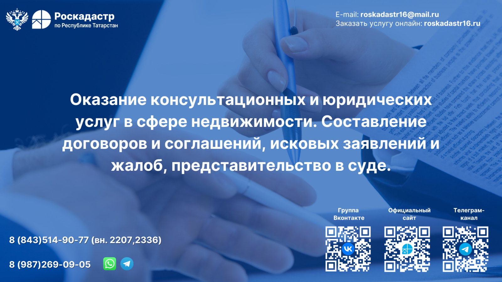 Филиал Роскадастра по Республике Татарстан оказывает широкий спектр услуг в сфере земли и недвижимости. Более подробно можете узнать на нашем сайте. (https://roskadastr16.ru/)